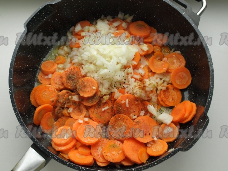 Лук мелко нарезать. Растопить в сковороде сливочное масло, выложить морковь, добавить лук, карри, кориандр, чёрный и красный перцы, посолить. Готовить, постоянно помешивая, 15 минут.
