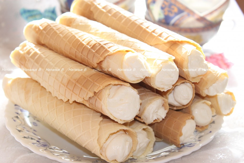 Охлажденные вафельные трубочки с помощью кондитерского мешка наполнить масляным кремом и подавать к столу.