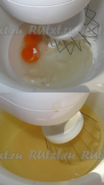 В чаше для миксера соединить 150 мл воды, желтки яиц и сахарную пудру, взбивать до однородной кремовой массы в течение 10-12 минут.