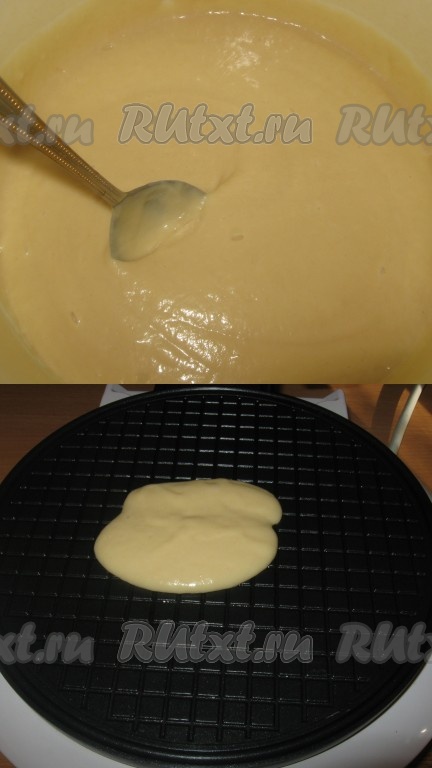 Выпекать вафли в электровафельнице, выкладывая по 1 столовой ложке теста.