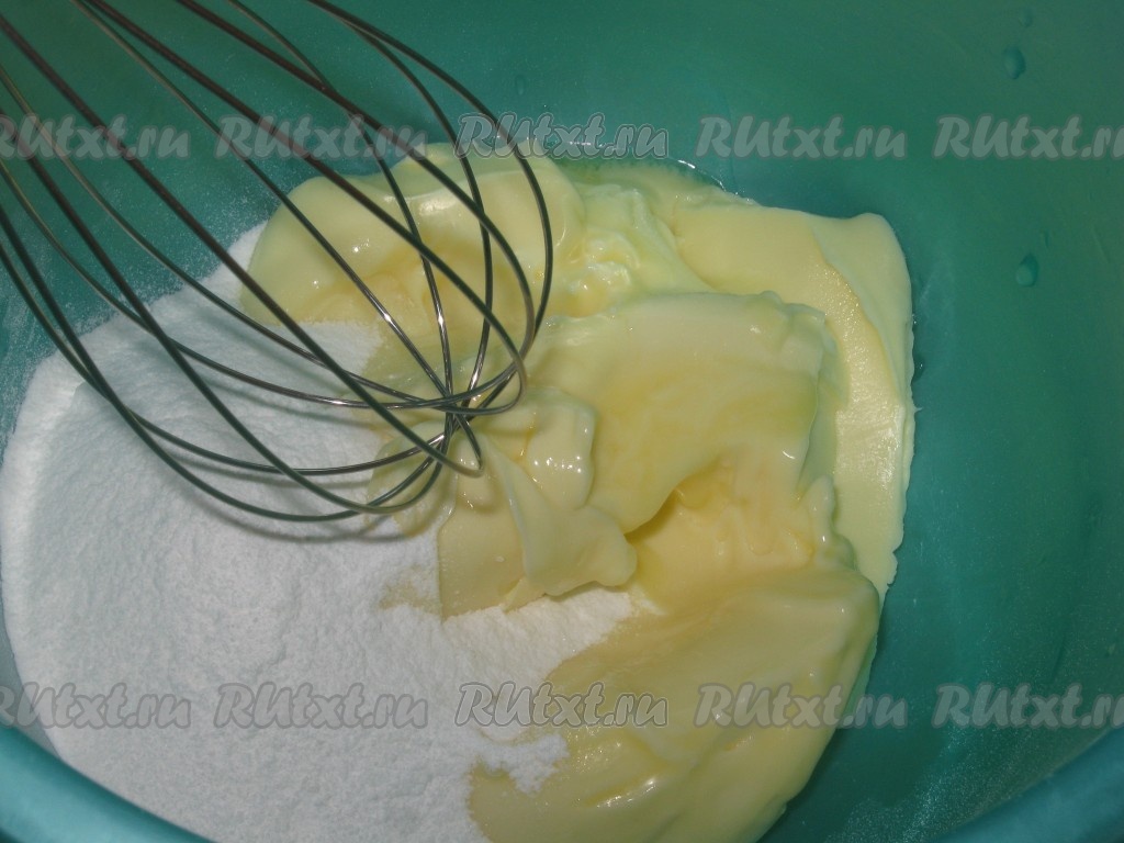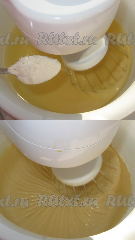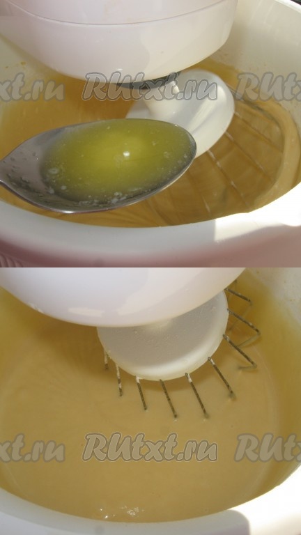 Далее влить растопленное масло, взбивать еще минут 8-10 до однородности.