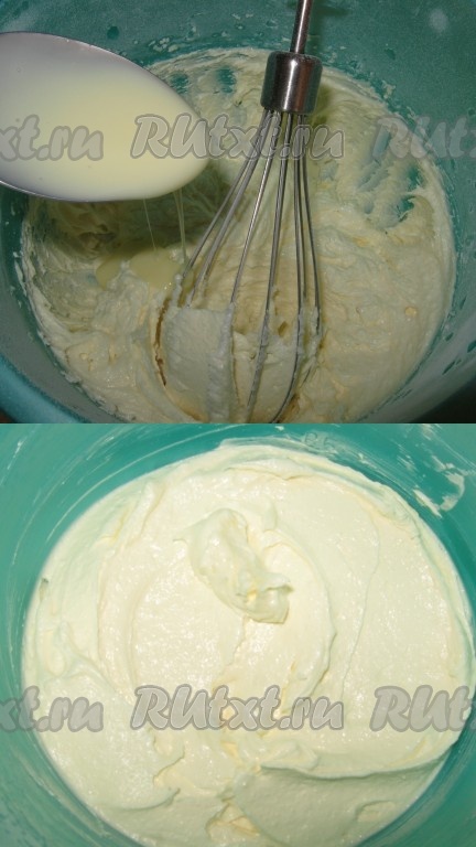 Затем, не переставая взбивать, добавить сгущенку, буквально, по 1 столовой ложке, тщательно взбивая после каждой. Крем взбить до однородной, воздушной консистенции.