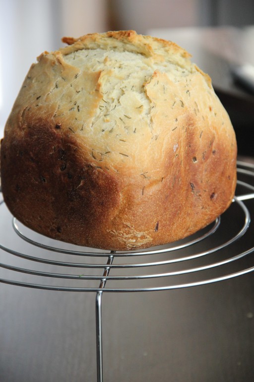 После окончания программы ведёрко с хлебом достаём из хлебопечки, вынимаем хлебушек из ведёрка и даём остыть на решётке. Хлеб с укропом получается вкусным и ароматным, он станет отличным дополнением к супам и другим блюдам.