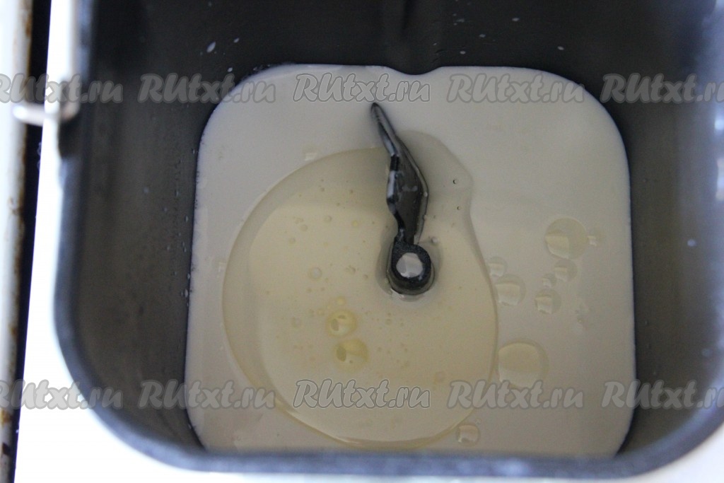 В ведёрко хлебопечки вливаем кефир комнатной температуры и растительное масло.