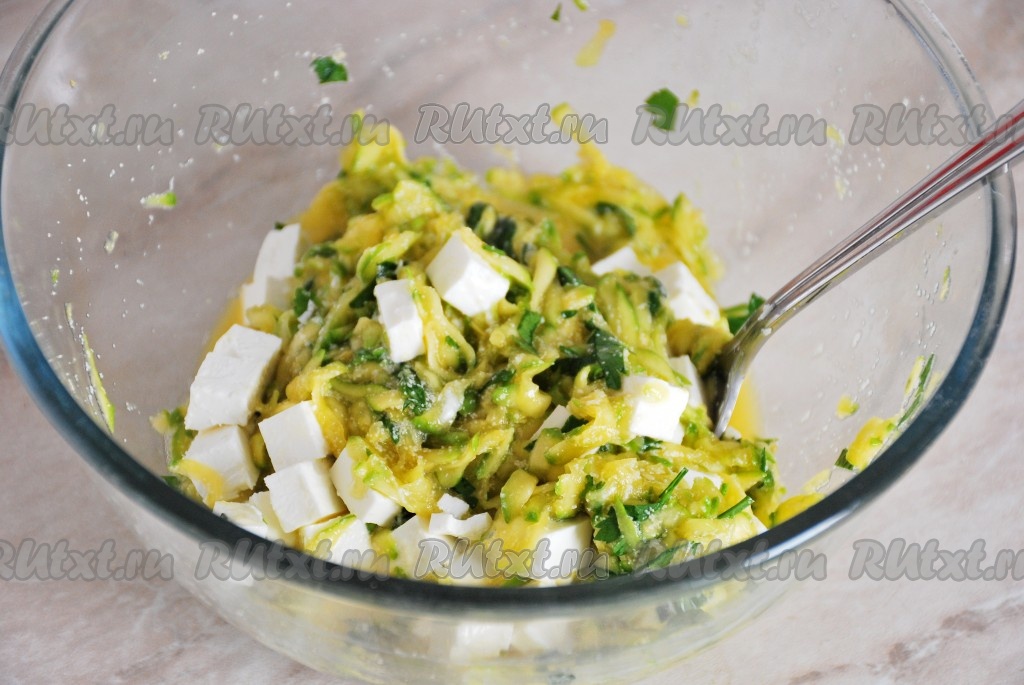 К натёртым кабачкам, отжатым от лишней жидкости, добавить мелко нарезанную зелень, яйца, манку, перемешать. Если нужно, подсолить получившуюся массу, но помните, что в дальнейшем будет добавляться брынза, а она достаточно солёная.