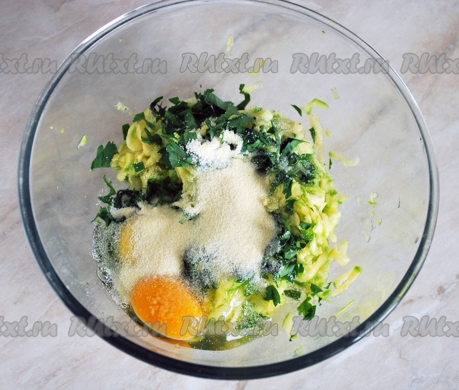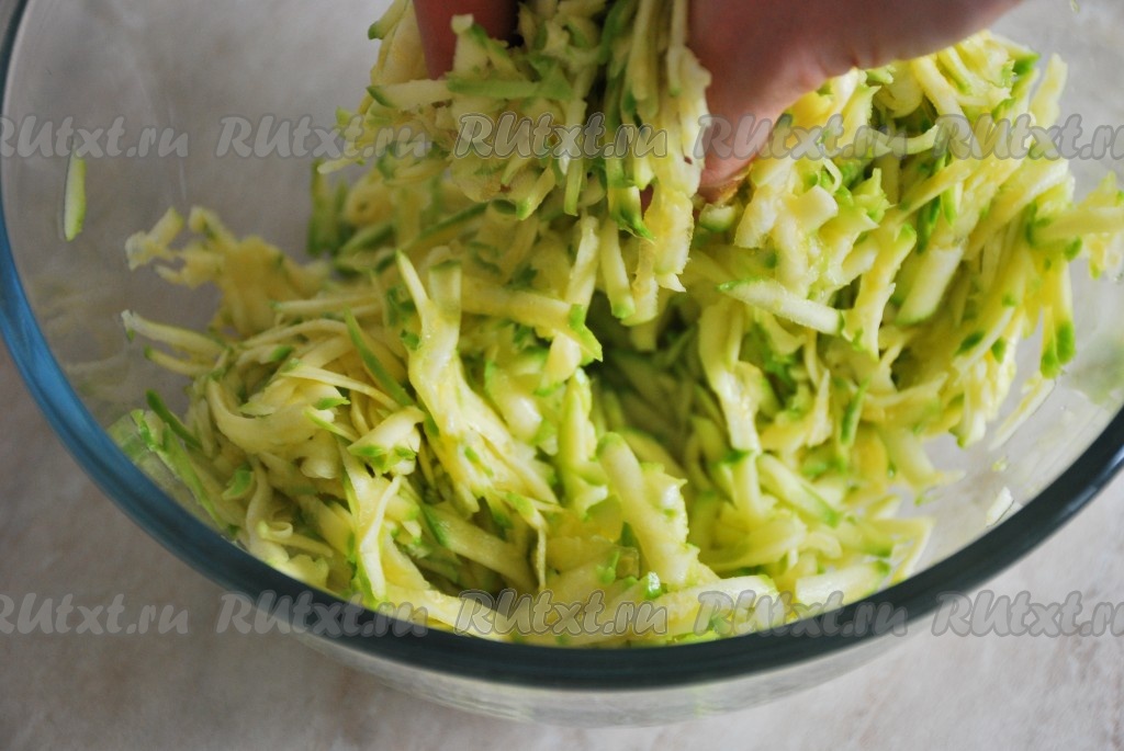 Натёртые кабачки посолить, оставить на 20-30 минут, затем хорошо отжать от лишней жидкости.