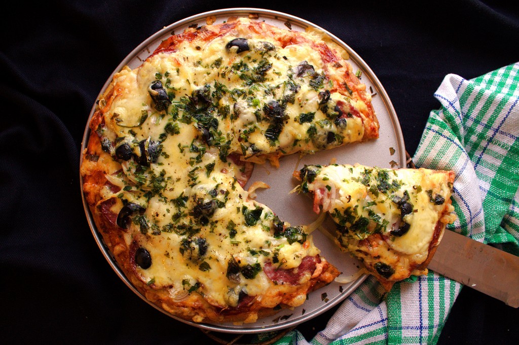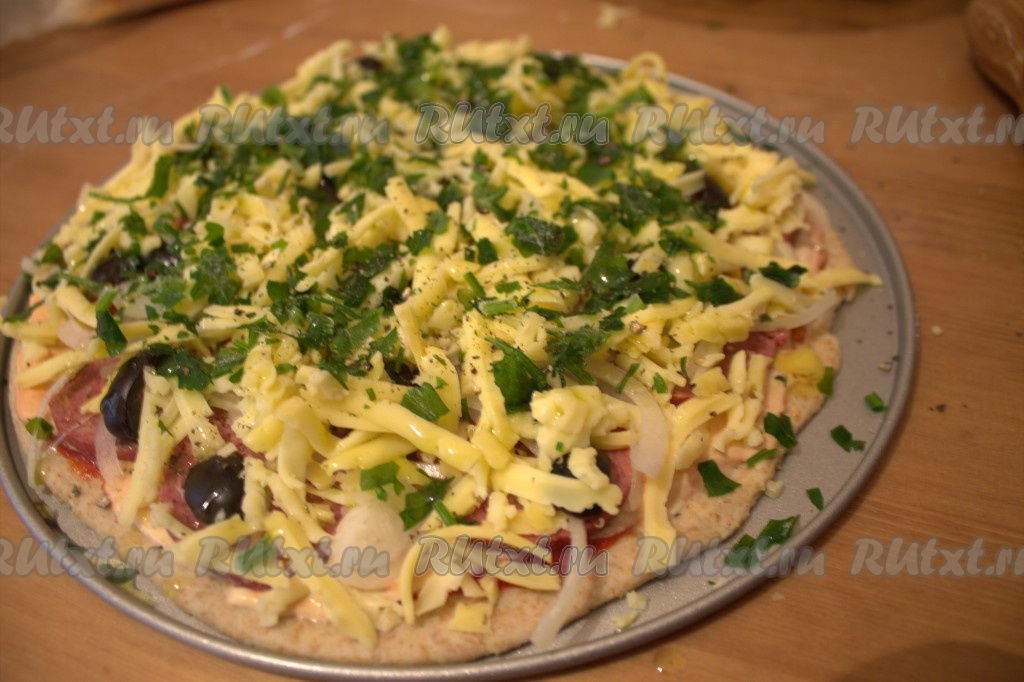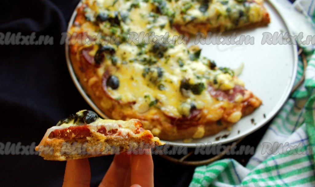 Пицца на бездрожжевом тесте получается очень вкусной и аппетитной.