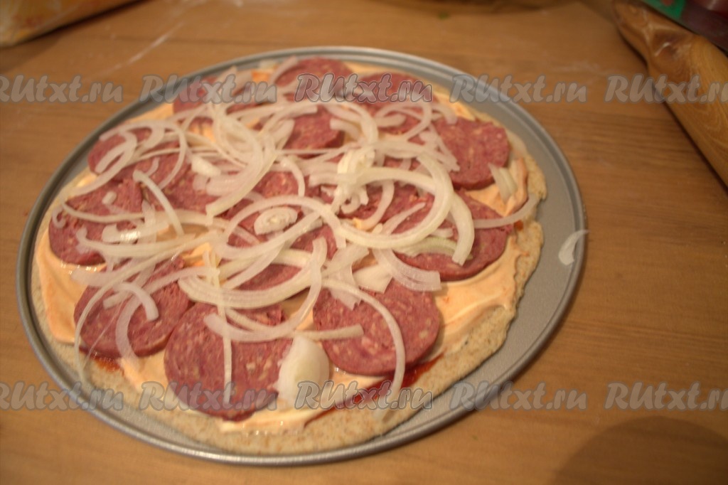 Порезать колбасу, лук, оливки. Намазать на тесто соус, майонез, выложить колбасу, лук и оливки.
