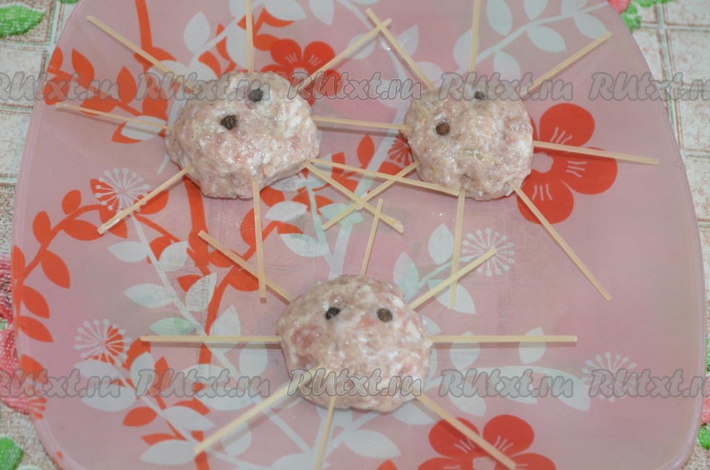 В каждую фрикадельку вставить по 2 горошины черного перца - глазки. Спагетти сломать пополам, вставить в фрикадельку - ножки.