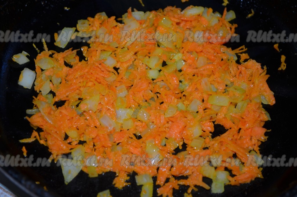 Морковь натереть, лук порезать кубиком, обжарить на небольшом количестве масла в течение 1-2 минут.
