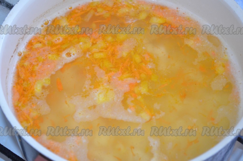 Воду или бульон вскипятить, посолить, закинуть картошку. Варить 5 минут. Добавить поджарку.