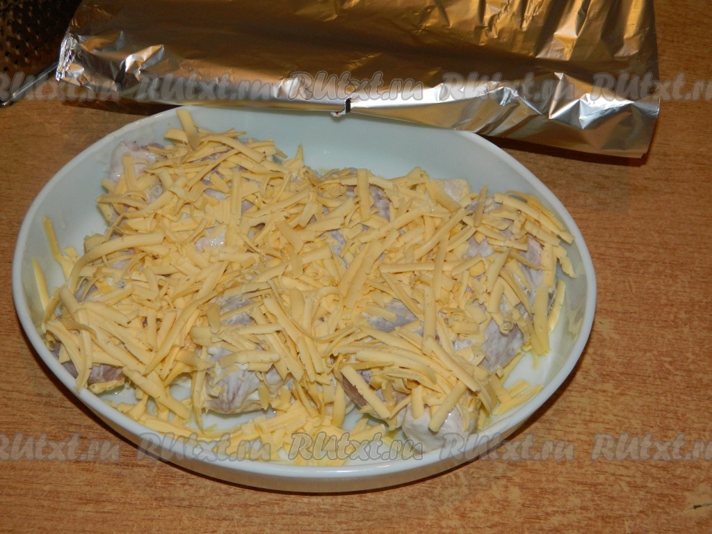 Выложить в форму, смазанную маслом. Посыпать тертым сыром. Прикрыть фольгой и поставить в духовку при температуре 200 градусов на 30 минут, затем фольгу снять и отправить в духовку еще на 10-15 минут для подрумянивания.