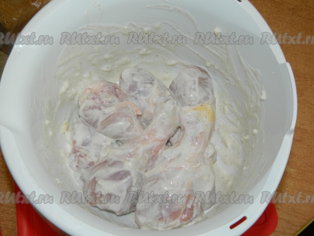 Куриные голени помыть, обсушить и хорошенько обмазать получившимся соусом. Убрать в холод на пару часов. Если нет времени, можно и сразу запекать.