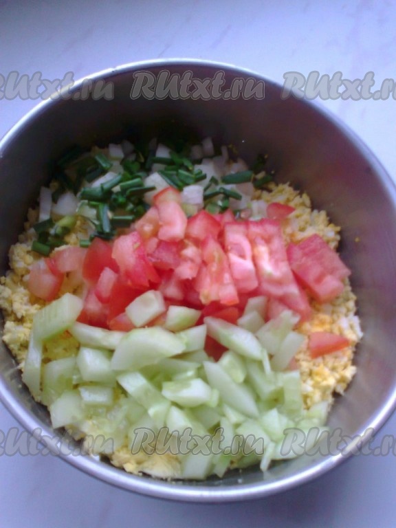 Половину помидора, оставшийся огурец и зеленый лук нарезать кубиками и добавить к желткам и белкам.