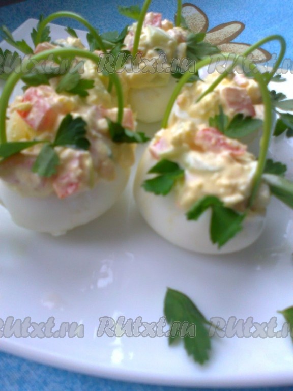 Листочками петрушки украсить блюдо и лукошки из яиц.