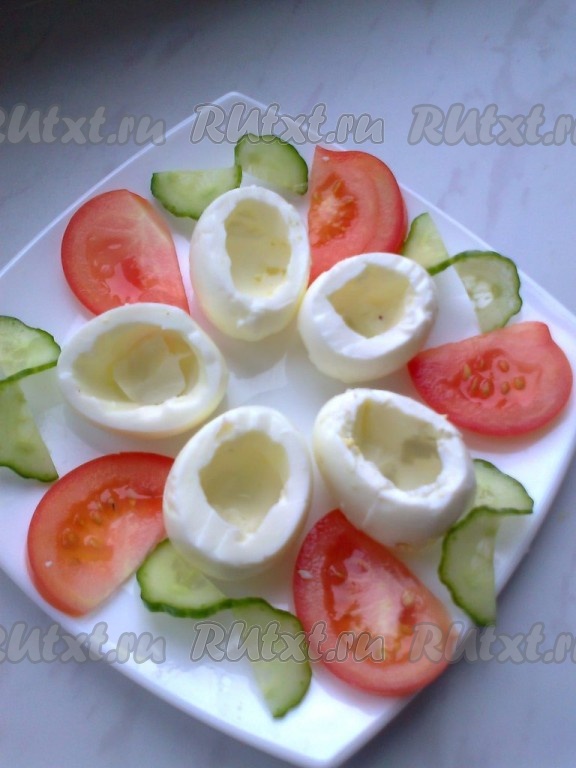 Углубить отверстие, чтобы было удобно накладывать салат. Половину помидора нарезать дольками и выложить на тарелку. От огурца отрезать 5 кружочков, разрезать почти до конца и развернуть половинки в противоположные стороны. Выложить на блюдо.