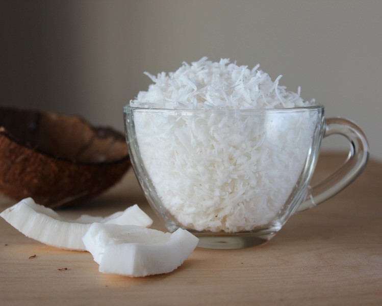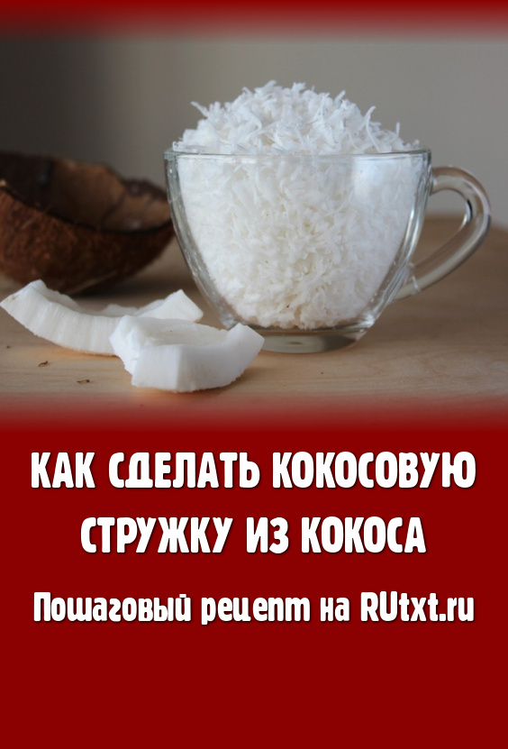 Белую мякоть кокоса натереть на мелкой (или средней) тёрке. Вот так просто можно сделать кокосовую стружку в домашних условиях. Она отлично подходит для приготовления различной выпечки. Если планируете хранить такую кокосовую стружку, тогда переложите её в один слой на противень, застеленный пергаментом, разогрейте духовку примерно до 120 градусов и выключите её, сразу поставьте в духовку противень со стружкой, по мере остывания духовки кокосовая стружка будет подсушиваться. Стружка должна стать сухой, если она подсушилась недостаточно, можно её досушить в духовке при температуре 40 градусов. После полного остывания подсушенную стружку можно хранить в закрытой таре.