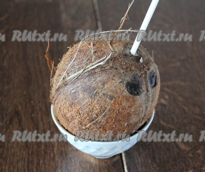 Одно из трёх отверстий в кокосе мягкое, найдите его и при помощи острого ножа проделайте отверстие.