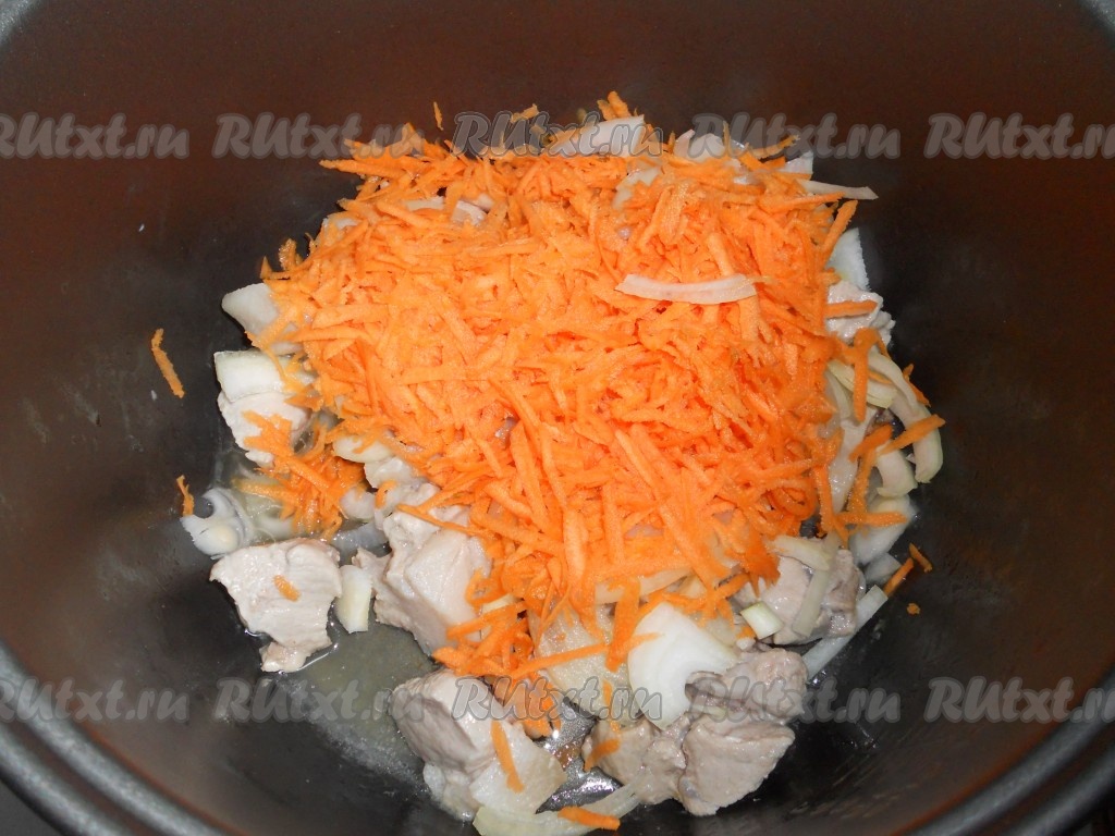В чашу мультиварки влить растительное масло, выложить мясо. Выставить режим "Обжаривание" на 10 минут. Затем добавить к мясу порезанный лук и натертую на крупной терке морковь. Готовить на том же режиме еще 10 минут.