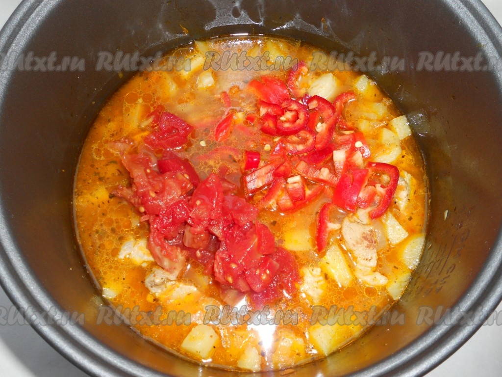 Выставить режим "Тушение" или "Суп" на 35 минут. После этого добавить очищенные и порезанные помидоры и порезанный сладкий болгарский перец.