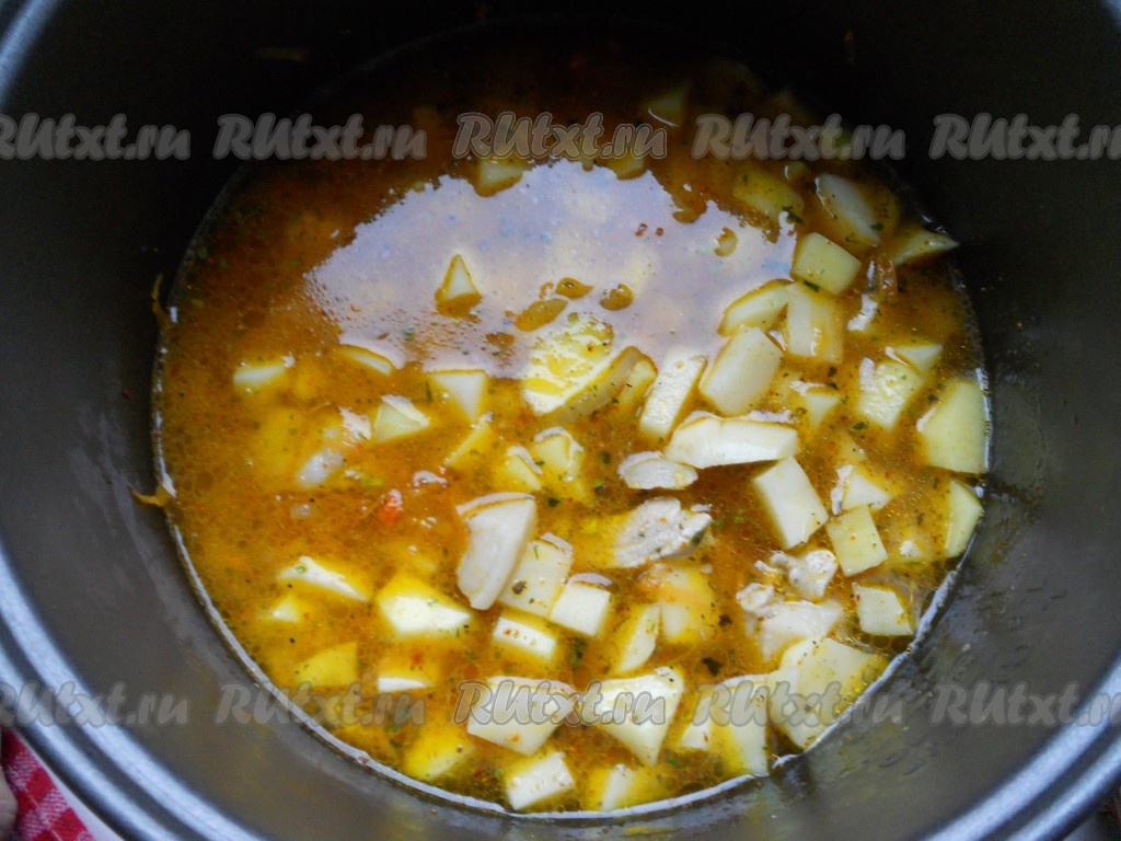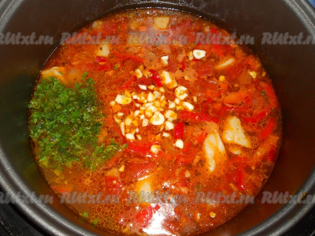 Далее готовить на том же режиме еще 30 минут. За 5 минут до окончания готовки добавить в суп измельченную зелень и порезанный мелко чеснок.
