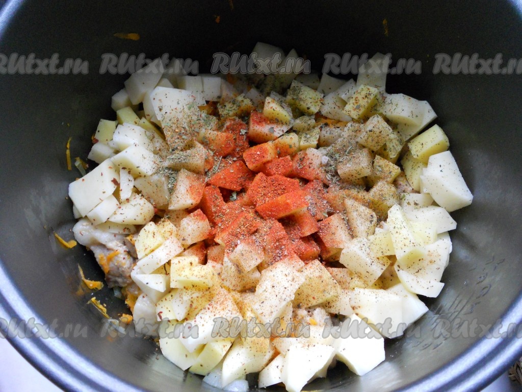 Картофель очистить, порезать кубиками, добавить к мясу и овощам. Посолить, добавить перец черный молотый, паприку и хмели-сунели.