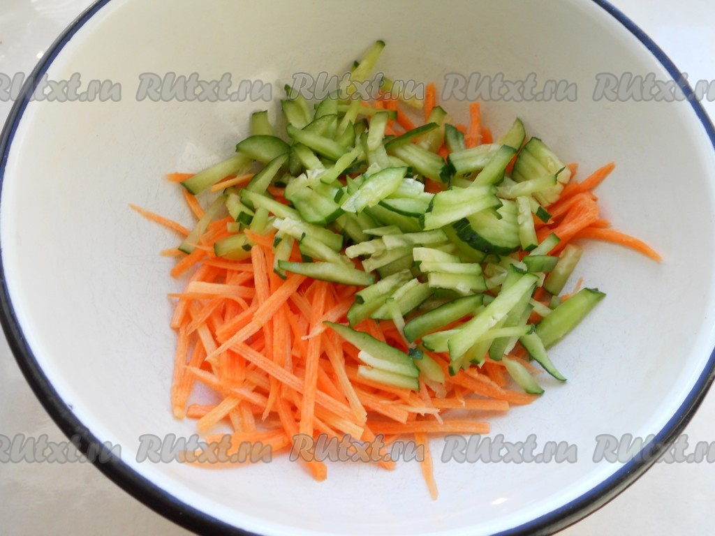 Морковь очистить. Редиску и огурец, вымыть, обрезая "кончики" с двух сторон. В глубокую миску натереть морковь на тёрке для корейской моркови (если такой тёрки нет, натрите на средней тёрке), добавить огурец, нарезанный на небольшие брусочки.