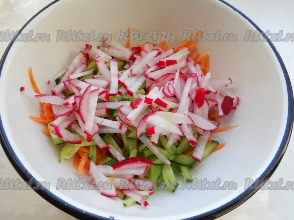 Сюда же добавить редис, также нарезанный на небольшие брусочки.