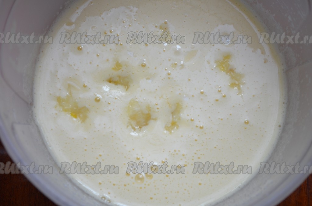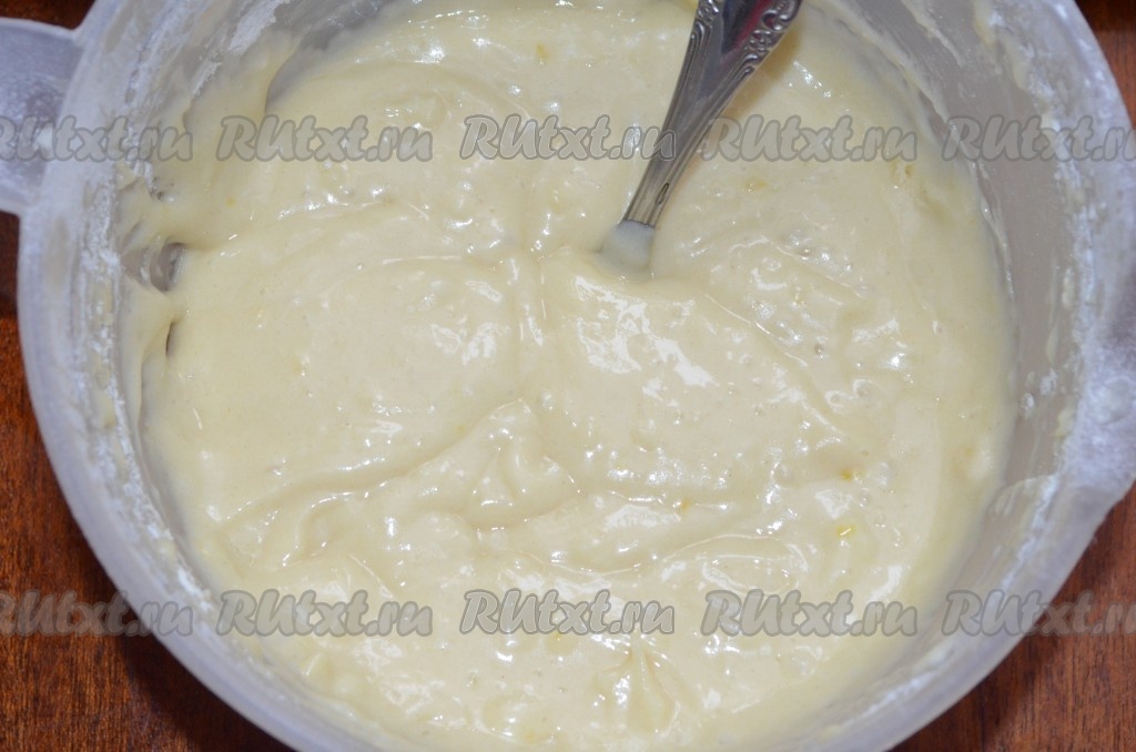 В получившуюся смесь добавить разрыхлитель, частями начать всыпать просеянную муку, перемешивая каждый раз ложкой до однородности. Тесто для лимонного пирога должно получиться однородным, напоминающим по консистенции сметану средней густоты.