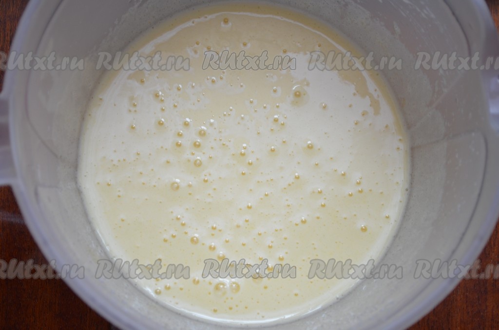 Лимон тщательно вымыть, разрезать на части, удаляя косточки, а затем пропустить через мясорубку (или измельчить его в блендере). В яйца, взбитые с сахаром, влить подсолнечное (или растопленное сливочное) масло и кефир, взбить миксером до однородности, затем добавить измельчённый лимон, перемешать.