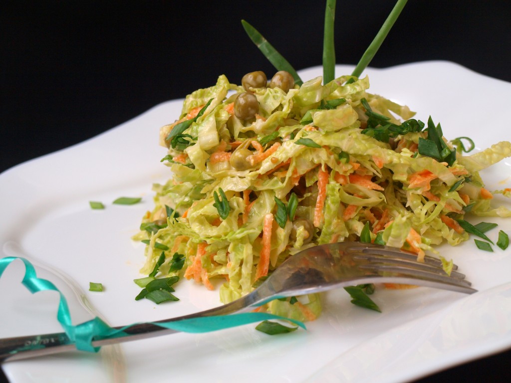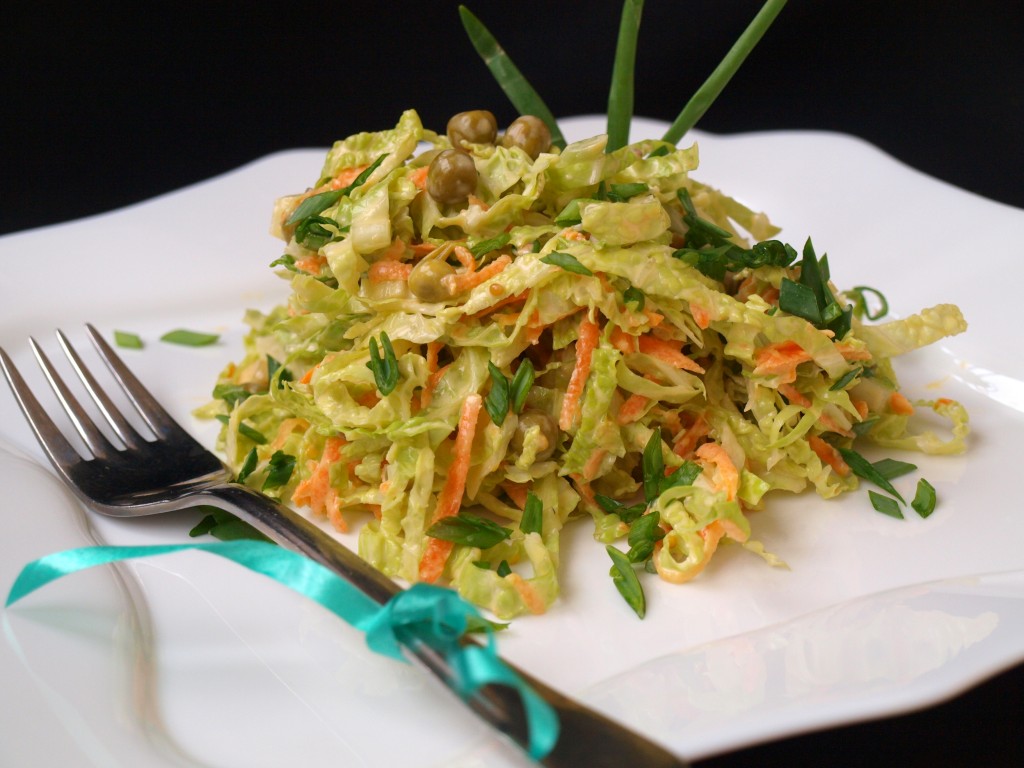 Салат из савойской капусты, горошка и сырой моркови получается вкусным и освежающим. К тому же савойская капуста малокалорийна и полезна (в ней содержится много витамина А и С).