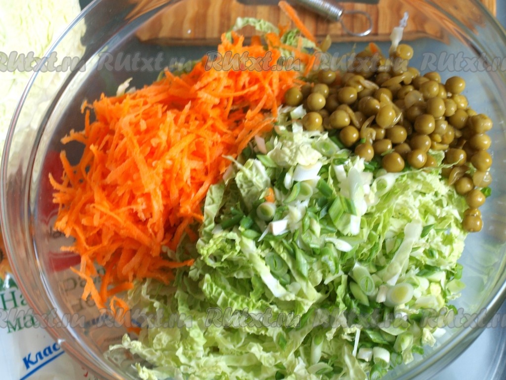 Морковь натереть на тёрке. Сложить в миску порезанную савойскую капусту, натёртую морковь, консервированный горошек и нарезанный зелёный лук.