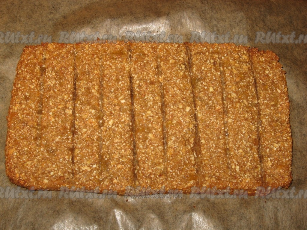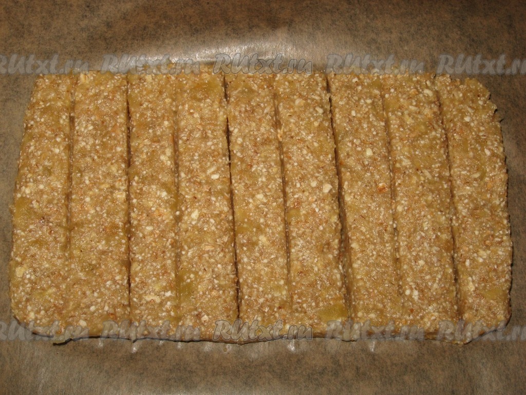 Поставить в духовку и при температуре 150 градусов подсушить в течение 40-50 минут (следить, чтобы не подгорало, при необходимости температуру снизить). Затем достать, аккуратно разрезать на несколько батончиков и полностью охладить.