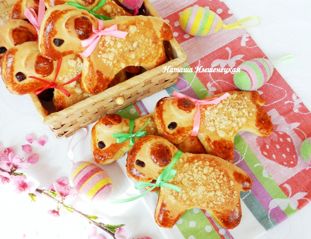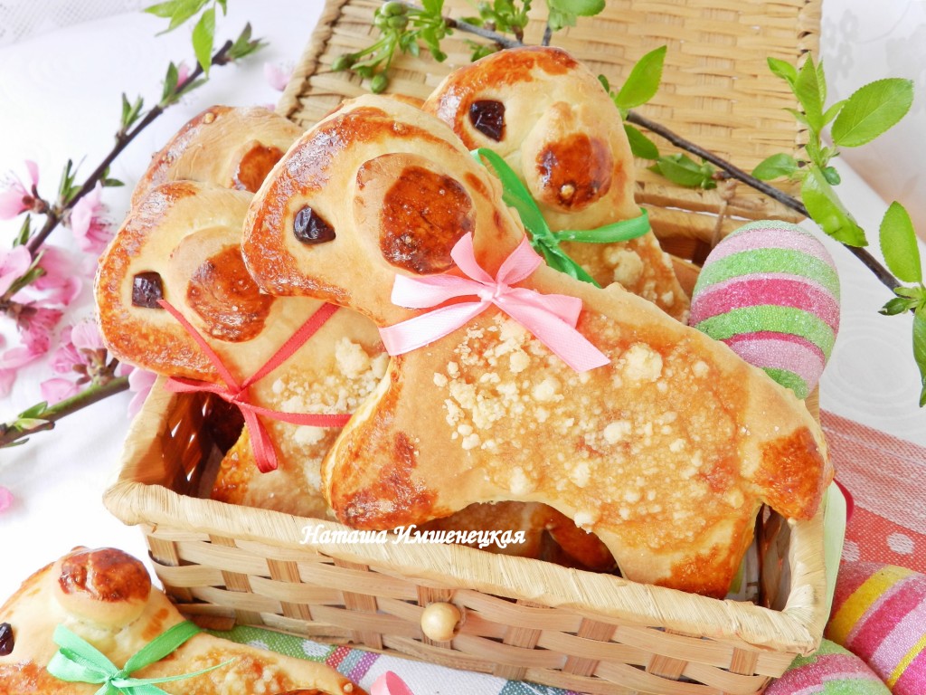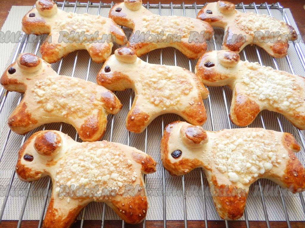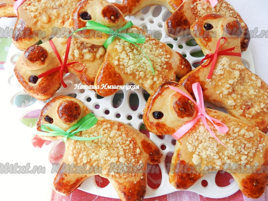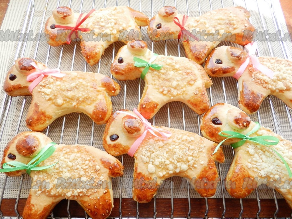Симпатичные фигурки барашков можно приготовить на Пасху для детей или в качестве приятного подарка для своих друзей. Пасхальные барашки приготовлены из сдобного дрожжевого теста на сметане, выпечка из которого всегда получается очень вкусной, пышной и мягкой. Из этого же теста можно сделать обычные булочки.
