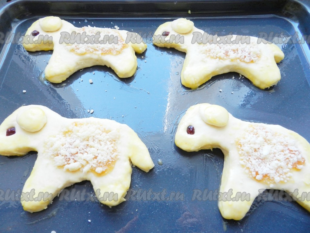 Посередине фигурки нанести персиковый (или другой) джем, посыпать сверху штрейзелем. Уши, мордочку, лапы и хвост смазать желтком. Оставить подходить еще 20 минут. Духовку разогреть до 190 градусов и выпекать пасхальных барашков в течение 20-25 минут.