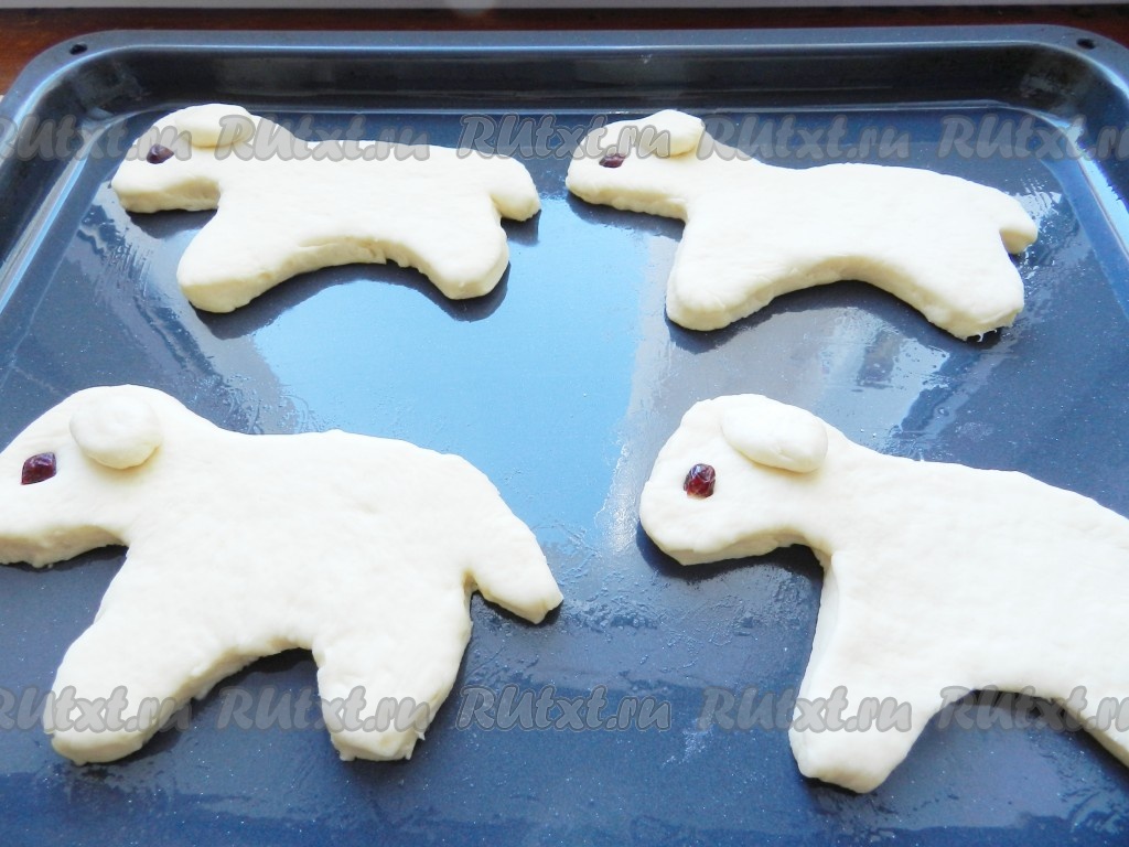 Противень смазать маслом. Выложить на него фигурки барашков. Из теста сделать ушки, а из клюквы или изюма - глаза.