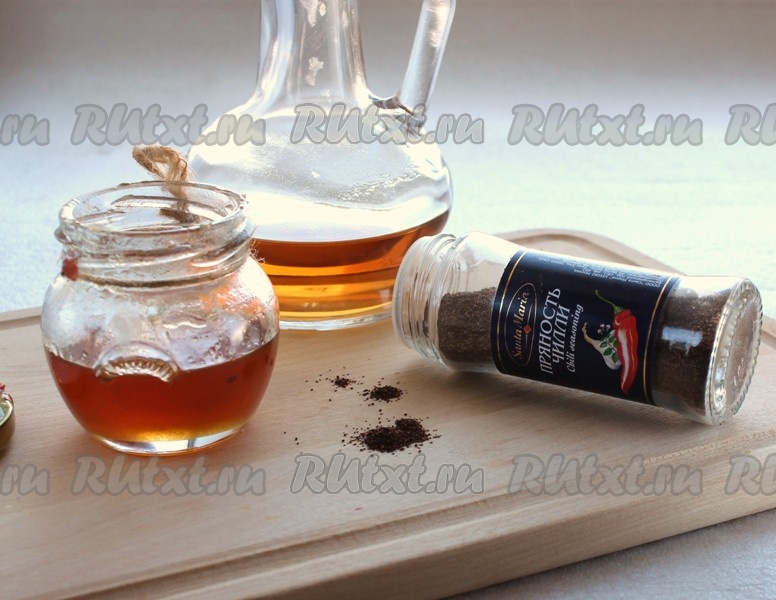 Приготовить заправку, для этого смешать оливковое масло, уксус, мёд, перец чили. При необходимости, можно мёд заменить на сахар, а яблочный уксус - на простой 6% уксус.
