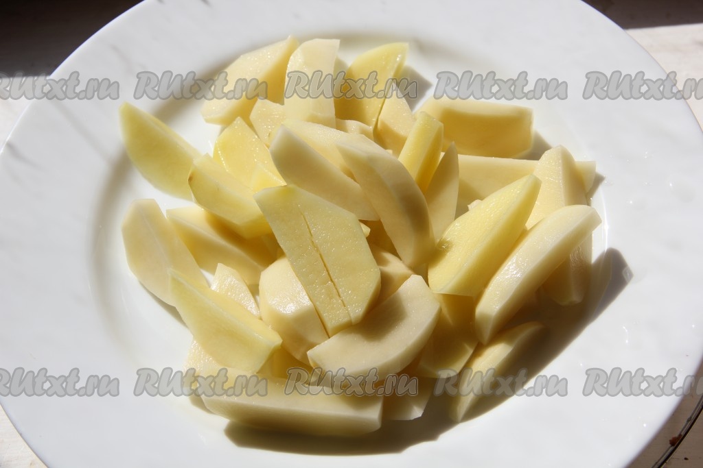 По истечении 30 минут добавляем в кастрюлю очищенный картофель, нарезанный соломкой, даём закипеть и варим минут 15 (до готовности картошки) на небольшом огне.