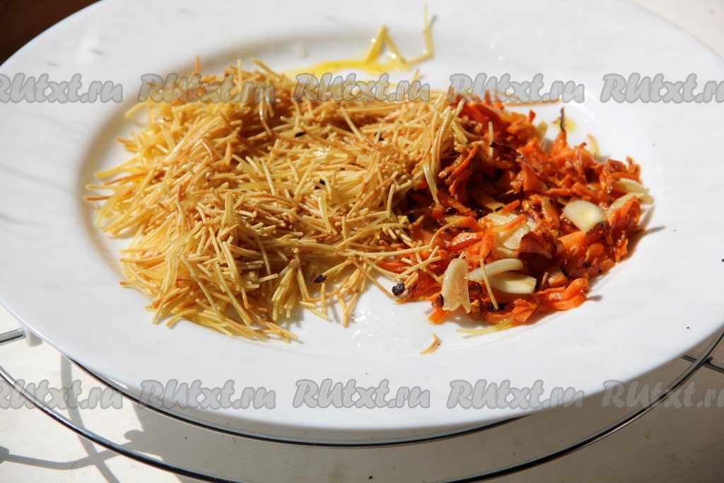 Морковку и чеснок очищаем. На сковороде разогреваем растительное масло, выкладываем морковку, натёртую на крупной тёрке, обжариваем её на среднем огне, иногда помешивая, минут 5 (до мягкости моркови), добавляем чеснок, нарезанный на тонкие пластинки, перемешиваем и готовим ещё 1-2 минуты, затем перекладываем на тарелку. Если на сковороде, на которой обжаривалась морковка, осталось мало масла, тогда смазываем сковородку немного маслом (я смазала с помощью силиконовой кисточки), после этого выкладываем вермишель и обжариваем её до подрумянивания (в течение 2-3 минут), помешивая, затем перекладываем на тарелку с морковкой и чесноком.