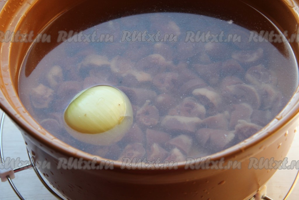 Куриные сердечки моем, очищаем от сосудов, нарезаем на кружочки и промываем водой. В кастрюлю вливаем 2-2,5 литра воды, выкладываем нарезанные куриные сердечки и целую очищенную луковицу, ставим на огонь, варим с момента закипания на небольшом огне 30 минут.