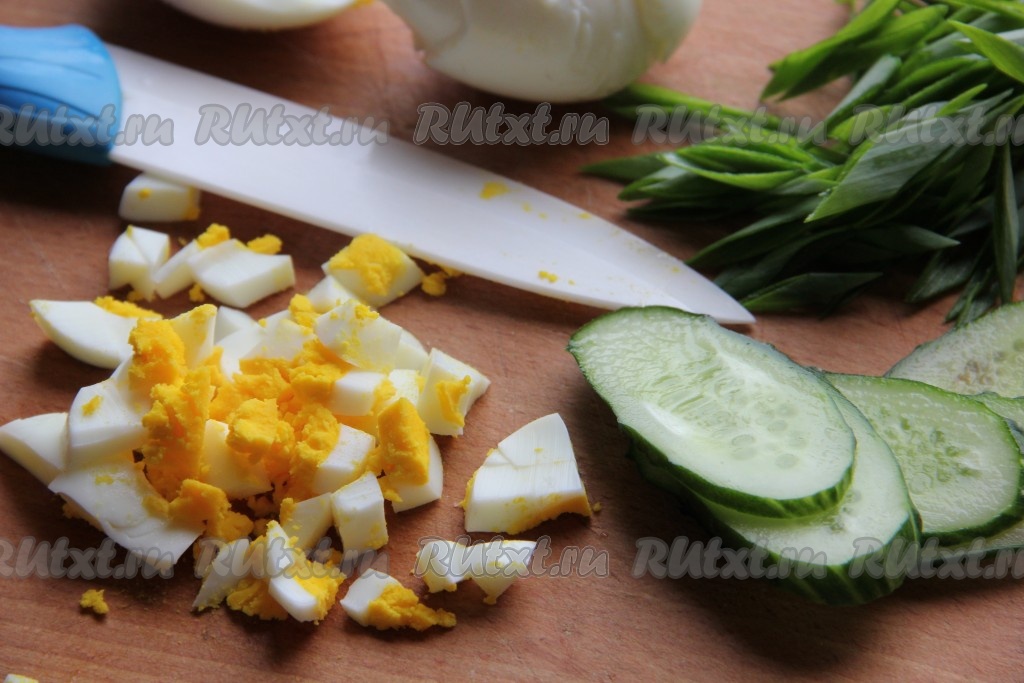Яйца отварить и нарезать кубиками, огурцы - ломтиками. Зеленый лук измельчить.