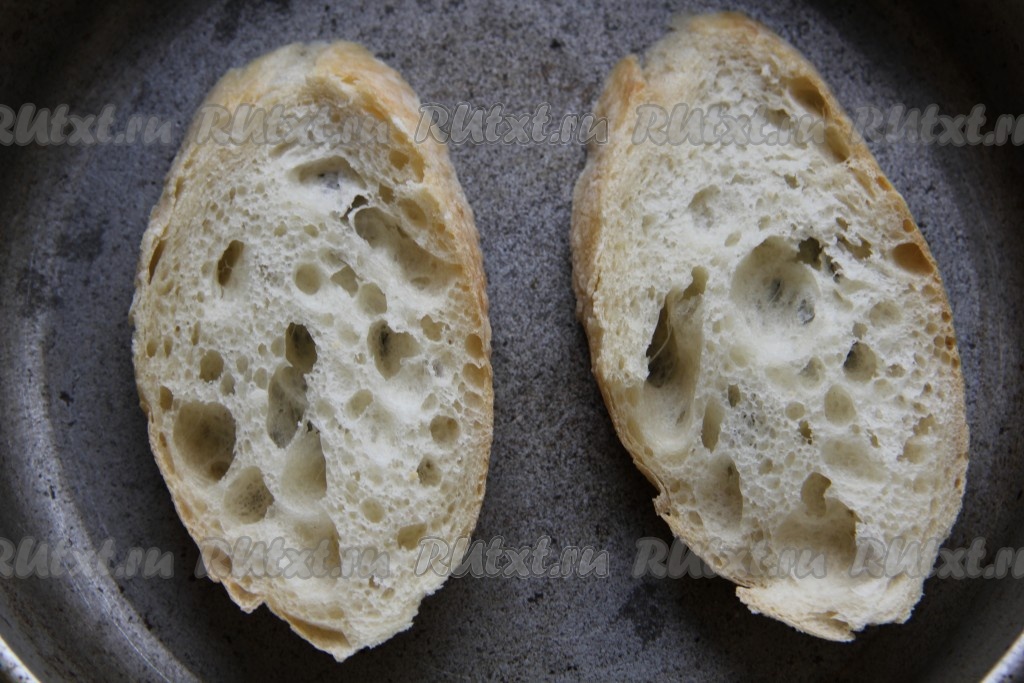 Багет подсушить на сухой сковороде с одной стороны. Подсушенную сторону багета натереть чесноком.