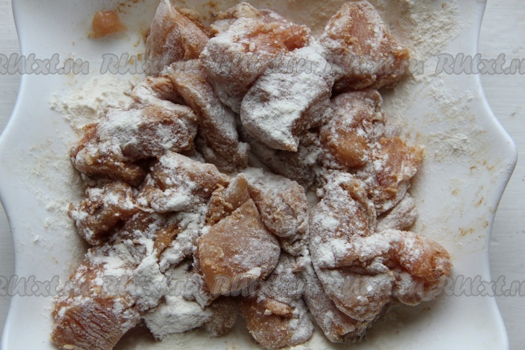 Сегодня будем жарить куриное филе на сковороде. Мясо нарежем на кусочки и обваляем в муке. Очень часто перед обжариванием кусочки филе обваливаются в яичном кляре, в этом рецепте будем готовить без яйца. Куриное мясо, обжаренное в муке по этому рецепту, получается очень сочным, аппетитным, его можно подать с картофелем или макаронами, отлично оно будет сочетаться с кисло-сладким соусом.