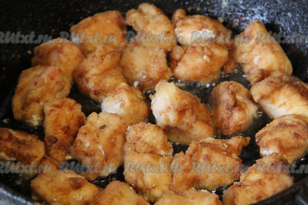 Сковороду хорошо разогреть вместе с растительным маслом. Выкладывать кусочки мяса на сковороду в один слой. Обжарить куриное филе на растительном масле на среднем огне примерно 3-5 минут с одной стороны (до подрумянивания), а затем перевернуть и обжарить 3-4 минуты с другой стороны. Готовые кусочки курицы выложить на салфетку, чтобы впитался лишний жир.