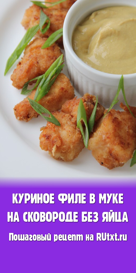 Куриное филе, жаренное в муке на сковороде без яйца, подаём с любимым гарниром или как самостоятельное блюдо вместе с соусом для мясных блюд.