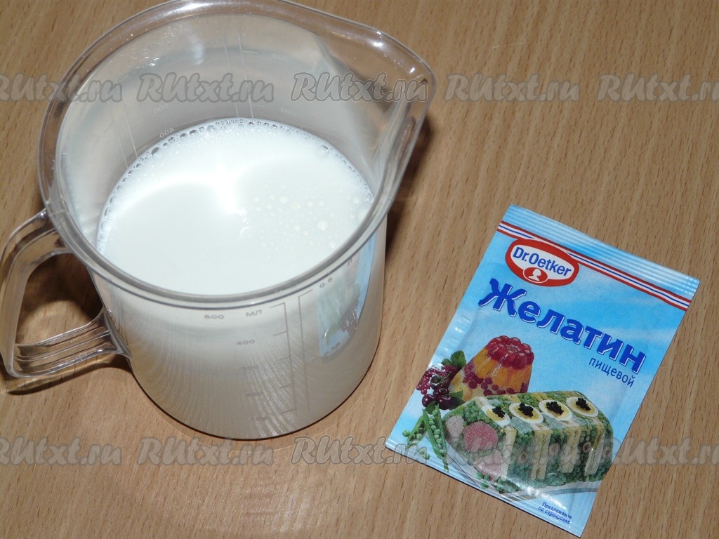 Пока готовится наш корж, приготовить творожное суфле: желатин залить молоком и оставить на 30 минут для набухания. Затем поставить на огонь и подогреть до полного растворения желатина (не кипятить!).
