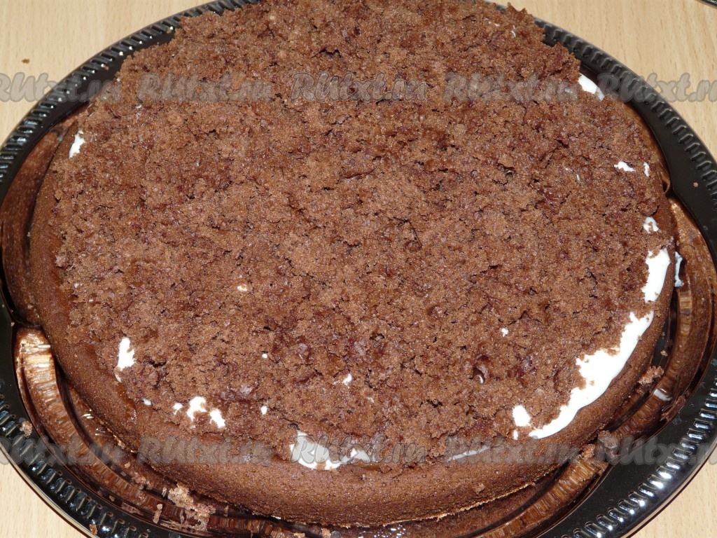 Сверху раскрошить остатки нашего коржа в виде горки, аккуратно прижимая. Поставить торт в холодильник на ночь.