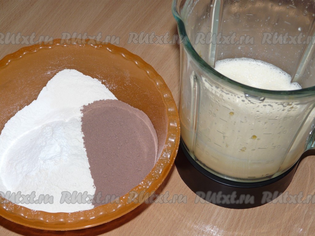 Муку смешать с разрыхлителем и какао. Яйца взбить с сахаром, затем добавить молоко и растительное масло, ещё раз хорошо взбить.