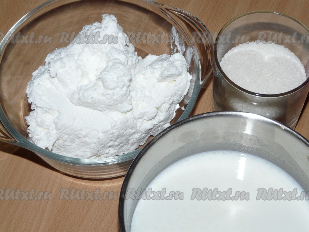 Творог взбить с сахаром, затем тонкой струйкой влить растворённый желатин. Всё хорошо взбить.