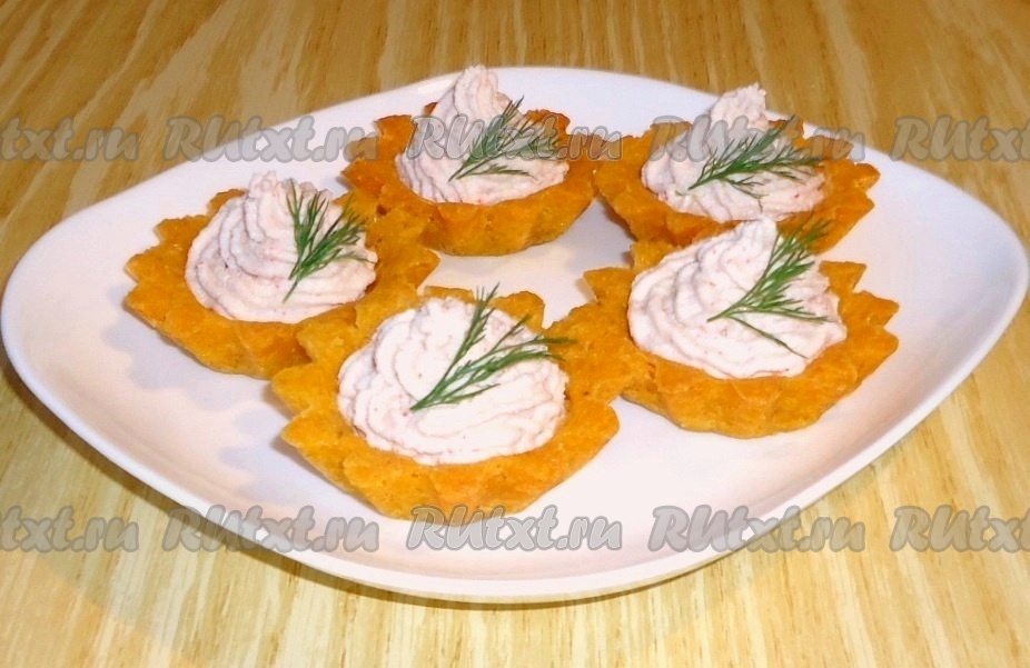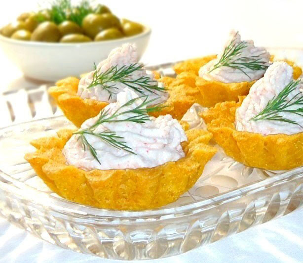 Тарталетки из кукурузной муки, наполненные нежным паштетом из крабовых палочек, - отличная закуска для любого стола!